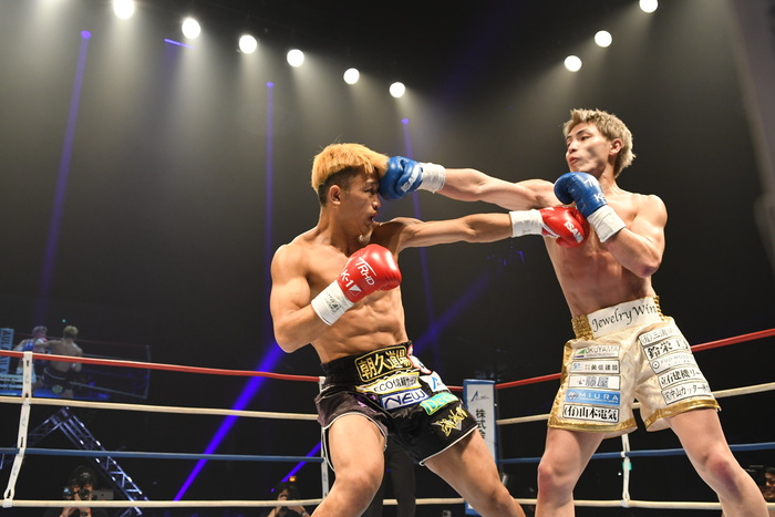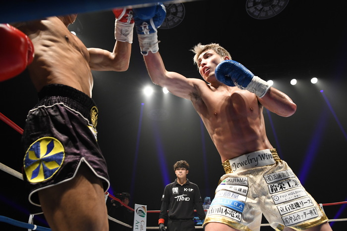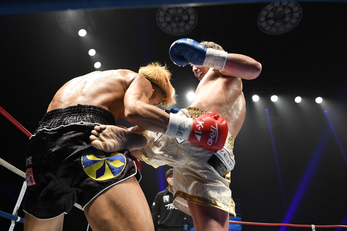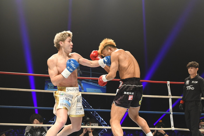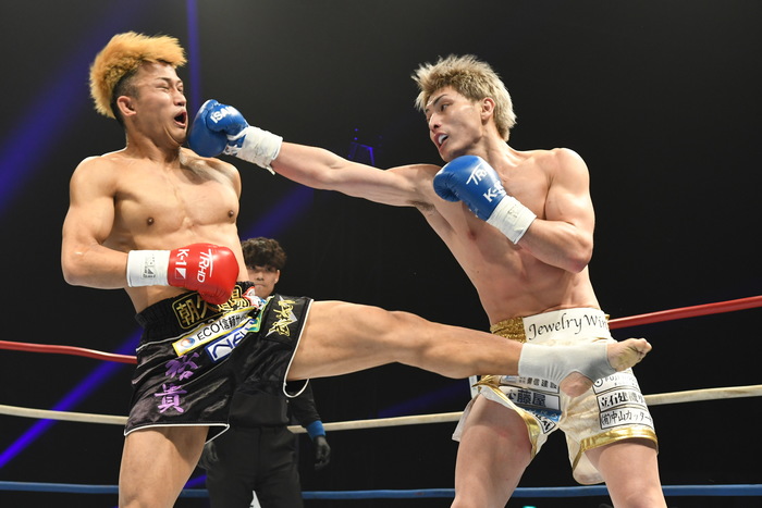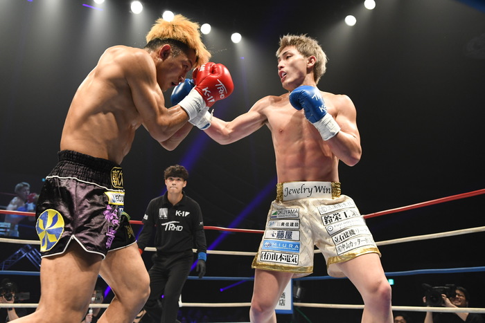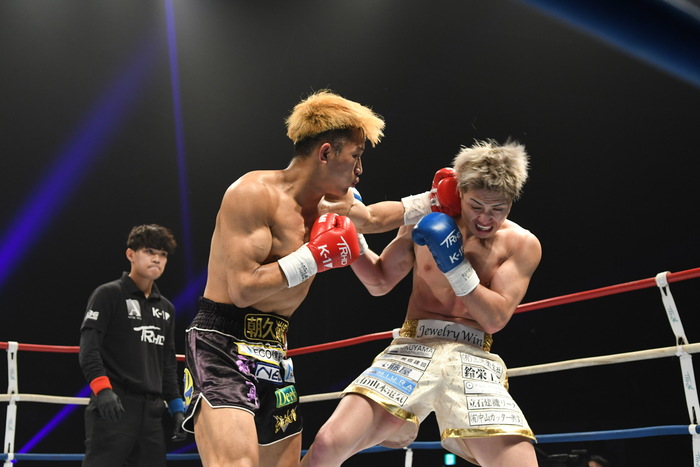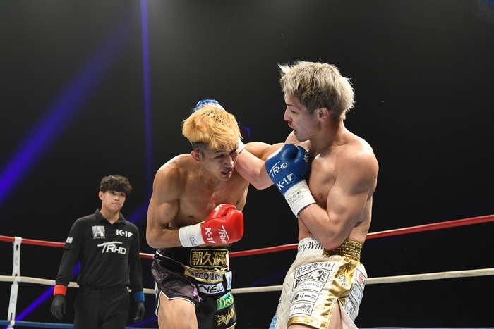朝久が前蹴り連打で前へ出たが、里見の右フックからの左右フック連打で朝久が身体を丸める。再び前蹴りから前へ出る朝久に里見は左を狙うが朝久がかわす。ならばと左ヒザを突き刺す里見。朝久は右前蹴りでボディ、左前蹴りで顔面を蹴る。さらに右三日月から飛びヒザ蹴り。朝久の右ストレートがヒットすると、里見も左ストレートを返す。いきなりの熱戦となった。