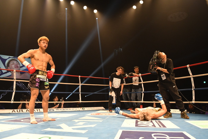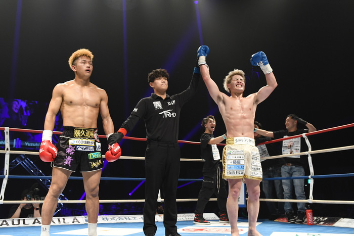3R、朝久が前蹴りを出せば、里見は左フックとジャブ。朝久は前蹴りをフェイントにワンツーをヒットさせる。負けじと里見は左ボディ、右ストレート。朝久はバランスを崩しながらも左右フックを打ち返す。左ローから左フックの変則的な動きは朝久。右三日月で前に出る朝久が左フックも当てる。