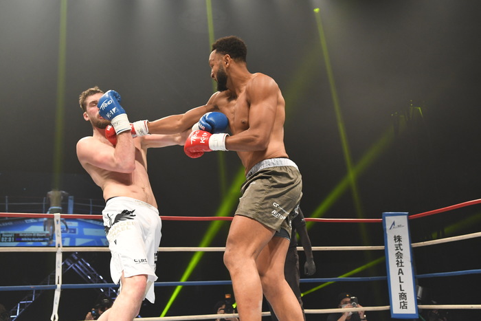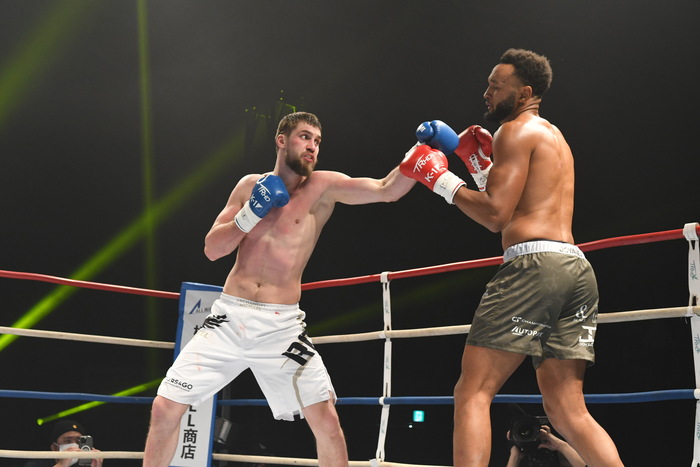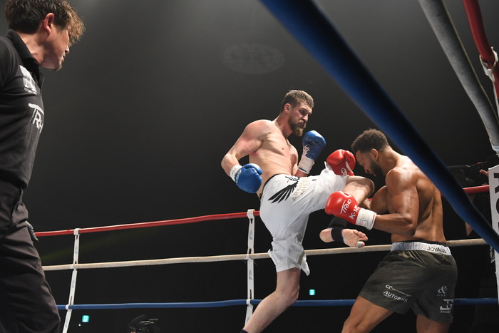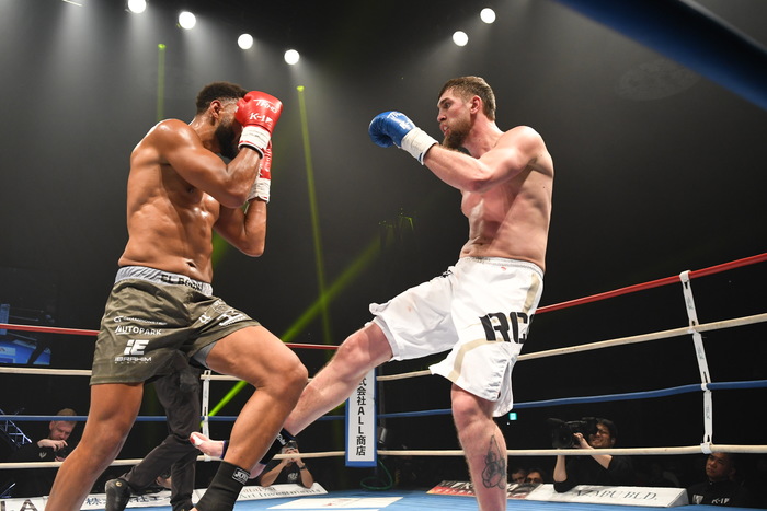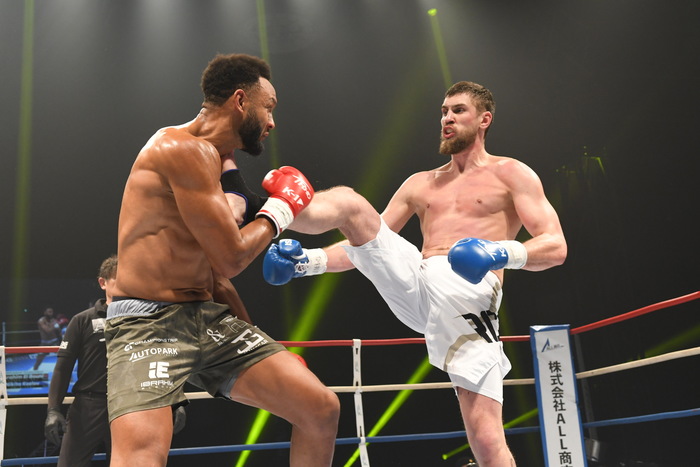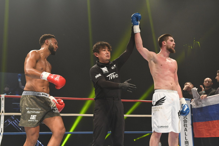 1R、ボウニは前後にステップを踏んでフェイントをかけ、いきなりワンツーで飛び込む。左フックも強振するボウニ。さらに左右のインローを蹴ると、コズロフは左右の連打で迎え撃つ。ボウニが左右フックで反撃すると左フックからの右アッパーでコズロフがダウンを奪った。