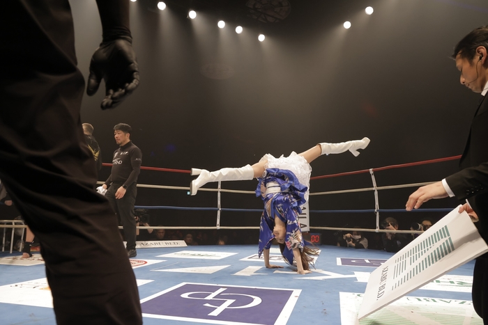 斎藤は、ミニ丈の和柄の着物風衣装で登場すると、2R前のインターバルでは前方スプリング、3R前のインターバルではバックブリッジを見事に決めてみせた。173cmの長身、長い脚がリング上でしなやかに1回転するパフォーマンスに、配信で観ていた世界のファンも驚いただろう。
