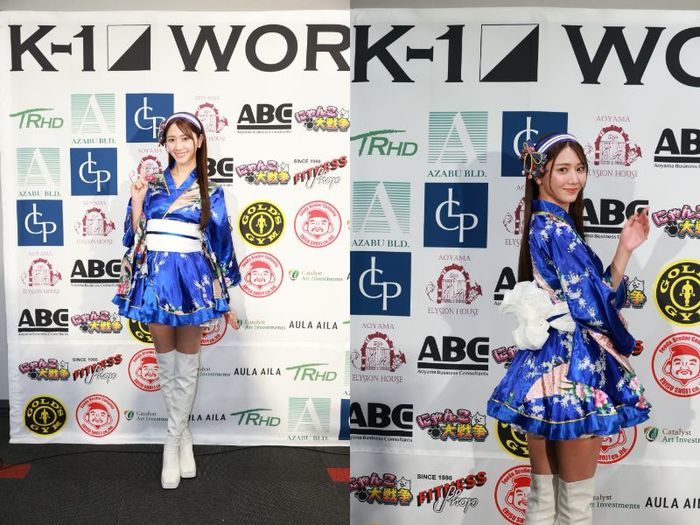 衣装については「和柄の着物風衣装を着させていただいていて、K-1カラーの青と、そして後ろ部分は華やかにしたいなと思ったので、帯を花形にしていただいたり、カチューシャを被ってみました。今回は海外から来ている選手が多いので、日本の文化といえばこの浴衣というか着物なのかなと思ったので、私の9頭身が分かるようにミニ丈のものをご用意していただきました」と説明。
