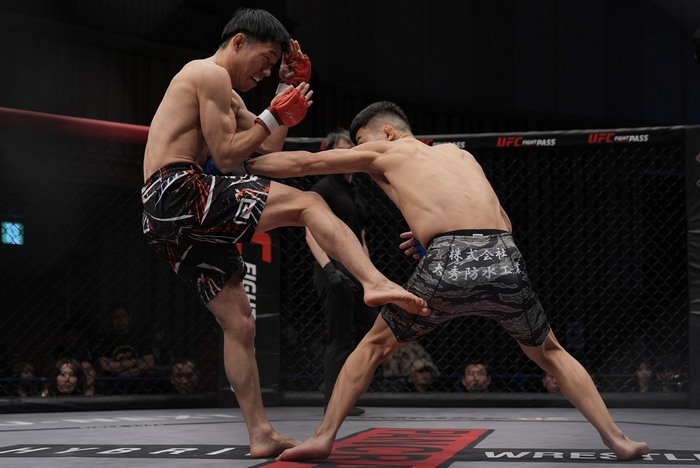 1R、ともにオーソドックス構え。ジャブを刺す鎌倉に今井は右ロー。右で差して押し込む。左でオーバーフック。カーフの鎌倉。今井は突き放す。ハイキックの鎌倉。ケージ背にすると、今井のボディロックテイクダウンを鎌倉が浴びせ倒して上でホーン。
