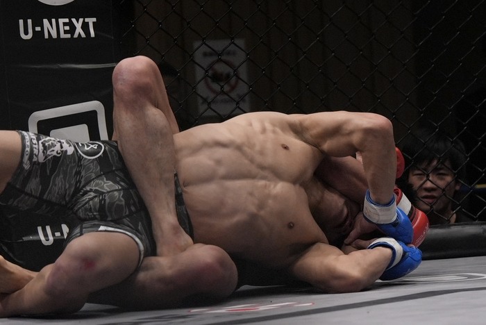 2R、鎌倉の右からのテイクダウンに今井が下に。左でリストコントロールして右のパウンドの鎌倉。サイドバックから鉄槌。足を手繰ってきた今井をがぶり。ガードに戻した今井。