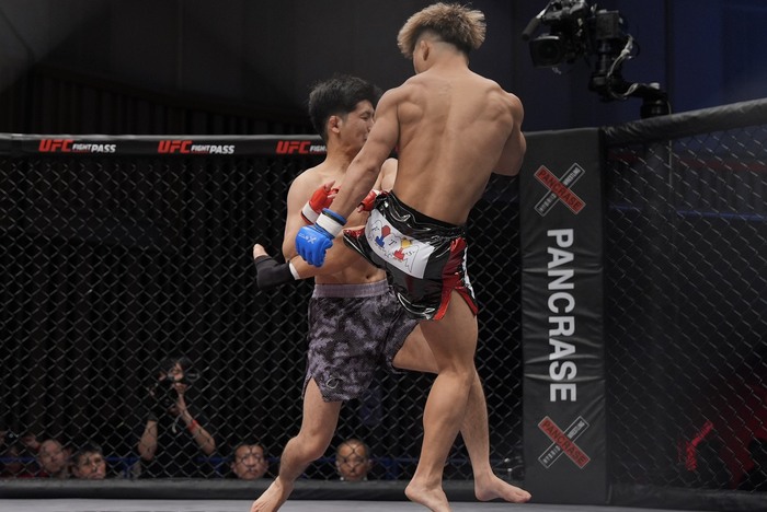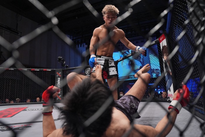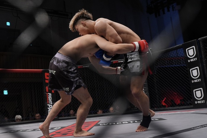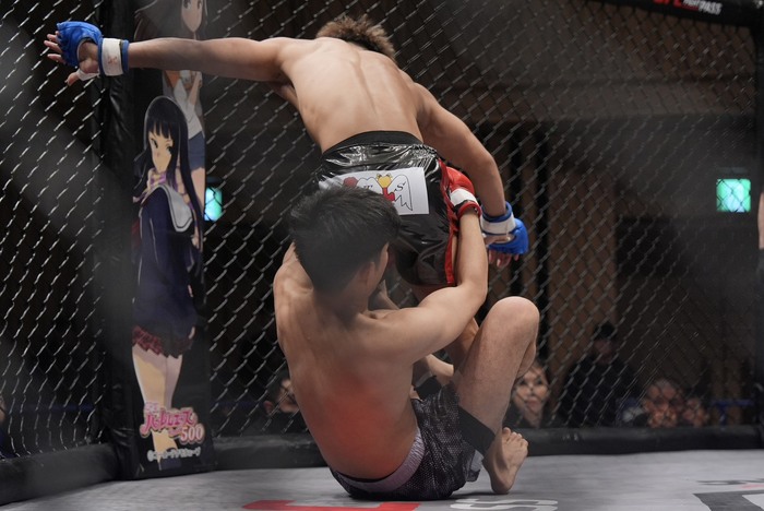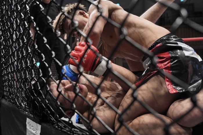 1R、サウスポー構えの齋藤が左の蹴りで前に。清沢は組んでケージに押し込み。体の入れ替えの齋藤に四つで小外を狙う。残した斎藤に清沢は小外がけテイクダウン。ハーフの清沢にパウンド。足を手繰る清沢に回って外してパウンド。体を放して蹴る。ブレーク。