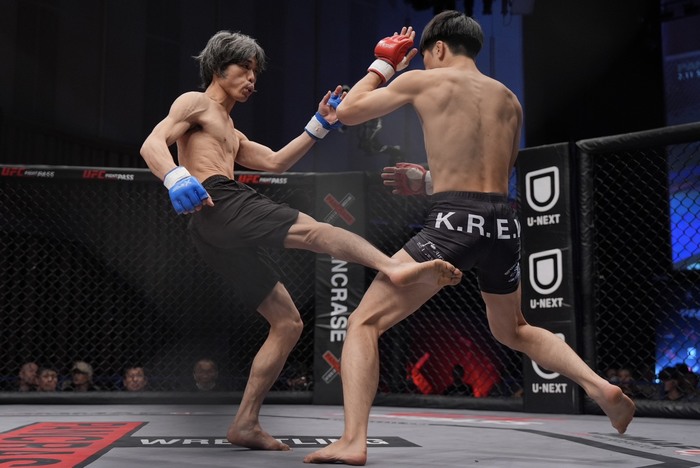 2R、吉田の蹴り終わりに組んでボディロックテイクダウンの大村。吉田をパス仕掛けるが、吉田は腰を斬りフルガードに戻した。トップの大村は片足を抜いてハーフに。さらに左ヒザを抜いてマウント。鉄槌。三角絞めに。最後の頭を抜いた吉田は鉄槌もホーン。