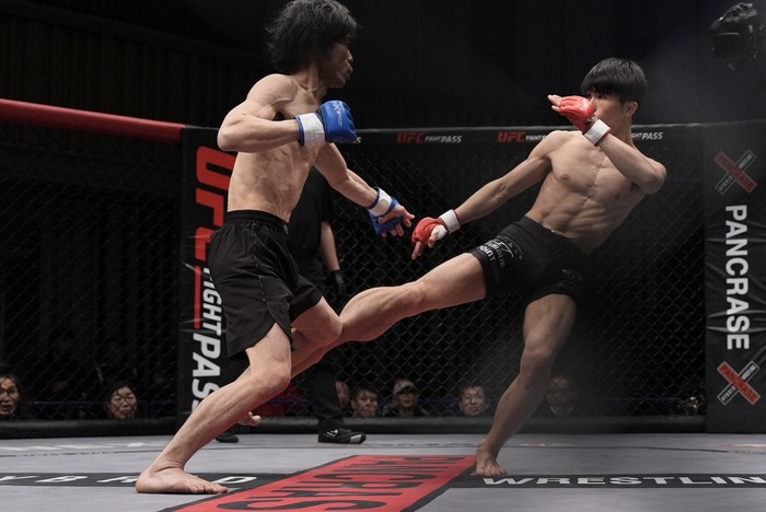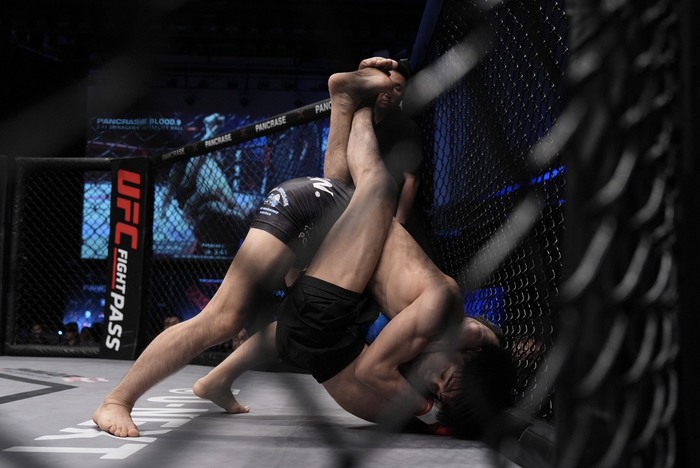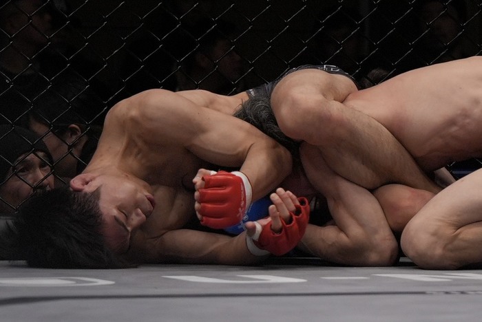 1R、右ローの吉田にダブルレッグテイクダウンの大村。下の吉田はクローズドガード。首を抱えると上の大村はヴォンフルーチョークも狙う。