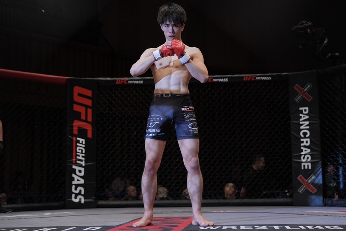 首を外した下の吉田はギロチンチョーク狙い。中腰になって相手の頭をケージに押し込む大村。上から細かいパウンド。最後に鉄槌をまとめる。