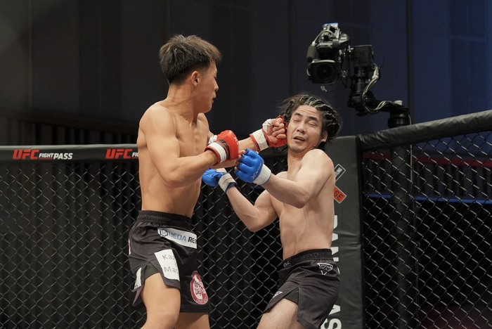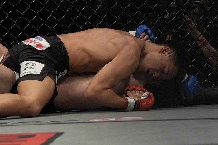 2R、ワンツーの右を伸ばして前蹴りの大澤。カウンターから組みを狙う稲田に、大澤は右ハイが顔をかすめる。かわした稲田はワンツーから組むが、大澤が四つで体を入れ替え、小外がけテイクダウン。いったん体を放してパウンドに入るが、稲田はクローズドガード。その中から大澤はヒジを突き、体を放してパウンドを狙いホーン。