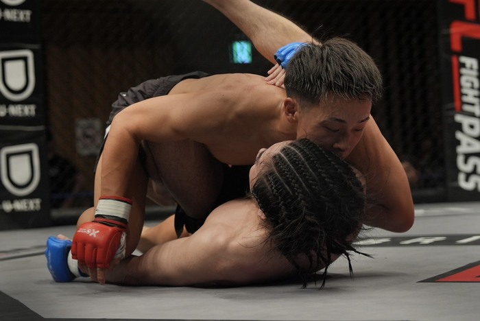 3R、右を突く大澤が四つからドライブして小外がけテイクダウン。パスガード、マウントでサイドに出て肩固めを極めた。