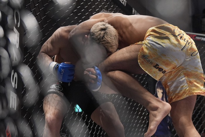 着地しなおも首相撲ヒザを突く小宮は、再びクローズドに入れてギロチン! 外した井川が上に。下の小宮はスイープで立ち上がり。シングルレッグの井川にヒザを突く小宮。しかし、バッククリンチの井川が背後からパウンドしてホーン。