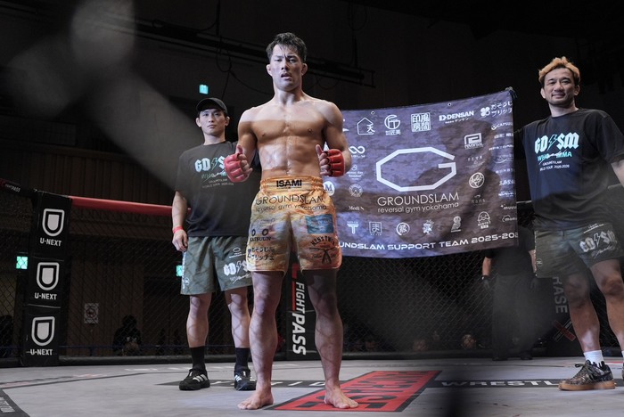 2R、互いに左右を振るなかで小宮は首相撲ヒザ! ダブルレッグテイクダウンの井川。ケージ背に座る小宮。井川は右のパウンドも立つ小宮がバッククリンチに。正対した井川はダブルレッグで持ち上げテイクダウン。すぐに立つ小宮を再びダブルレッグテイクダウンの井川。右で差して立とうとする小宮の頭を押さえつけるが、立ち上がった小宮。正面に回りダブルレッグの井川。
