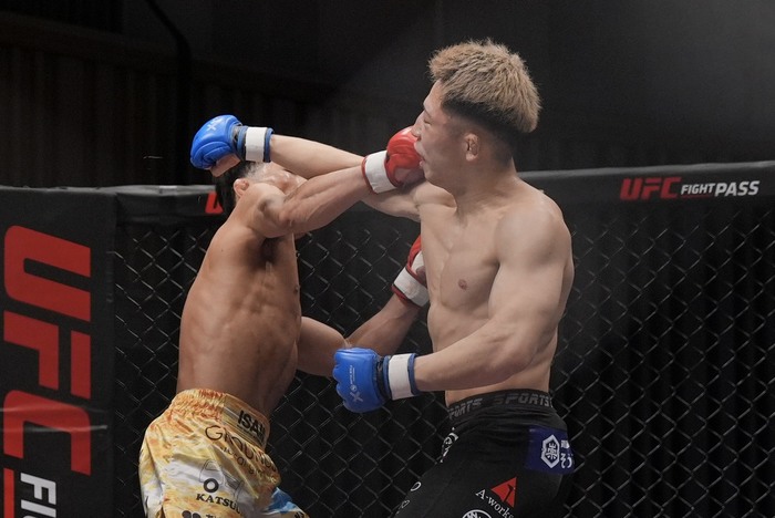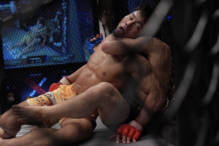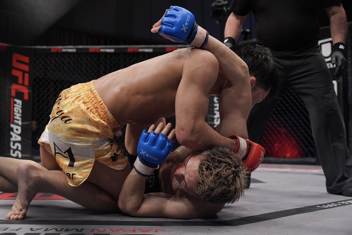 3R、右カーフを打つ小宮。動きが鈍い井川に左右連打で前に出ると、井川は右で差して押し込み。それをがぶり落としてネルソンでめくろうとする小宮に、トップを奪う井川がスクランブルする小宮のバックに。