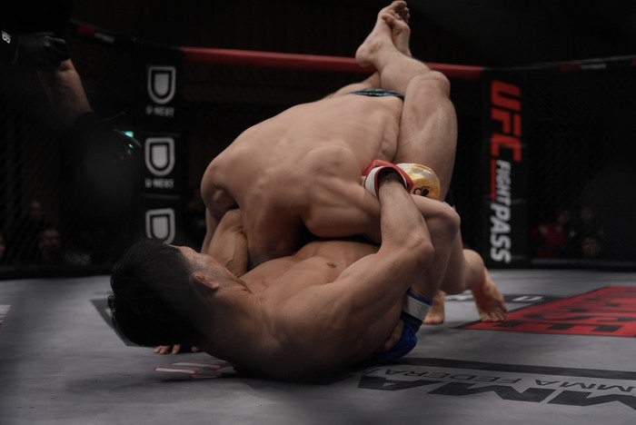 そこにネルソンでめくった小宮が上に。両足で足を束ねて細かいパウンド。足を抜いた井川がシングルレッグに、そこに小宮はギロチンを合わせる。