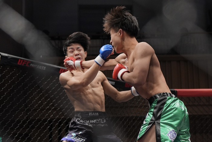シングルレッグで飛び込む伊藤をさばく大鹿は左ミドル。回る伊藤は、ワンツーの飛び込み。かわす大鹿に左から右を突いてシングルレッグ。ケージまでドライブも倒れない大鹿は右ロー。