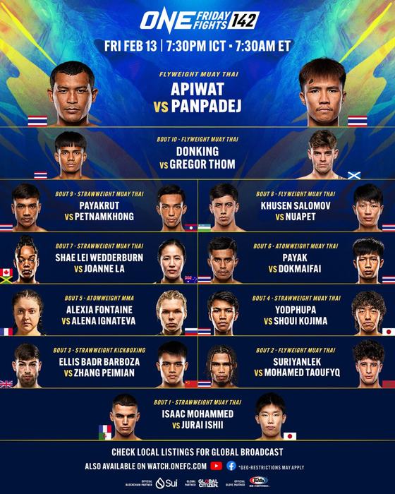 2026年2月13日(金)タイ・ルンピニースタジアム『ONE Friday Fights 142』(U-NEXT配信)の全対戦カードが出揃った。