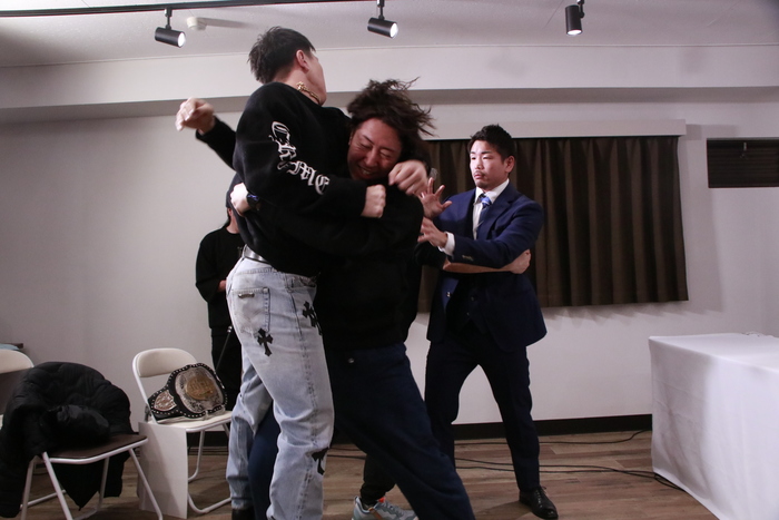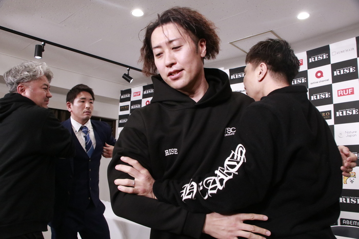 両者は会見場に現れ、ツーショット撮影後のフェイスオフ撮影になると國枝が顔を近づけて額を押し付け、これに怒った森本が胸ぐらをつかんでもみ合いに。すぐにスタッフが止めに入ったが、蹴りとパンチが飛び交う乱闘に。
