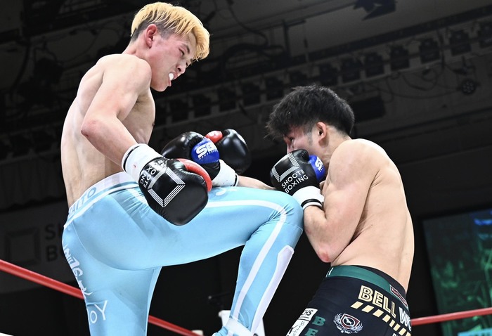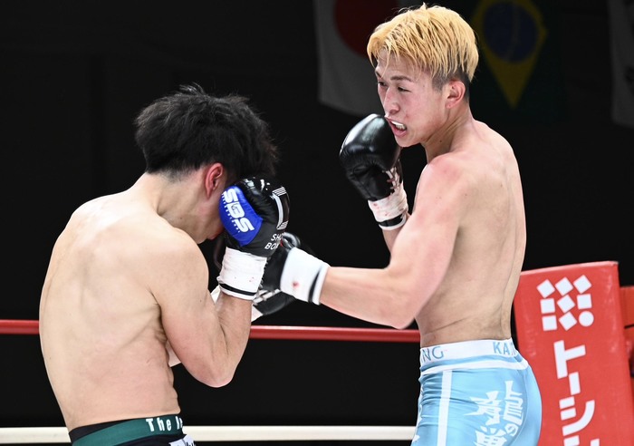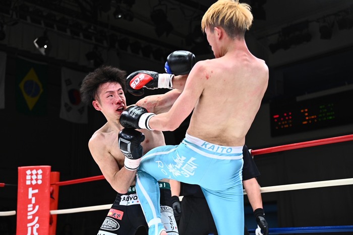 3R、内藤はワンツーで前へ出ていくが、これがバッティングに。再開後、ワンツーで突っ込んでくる内藤をジャブ、ヒザ、右ストレートと様々な技で迎え撃つ魁斗。前に出る内藤のパンチをかわし、左フック、左ボディと次々とヒットを奪っていった。