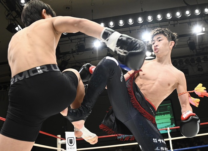 1R、サウスポーの片山はジャブ、インスは左右に構えを頻繁にスイッチする。片山がインローを蹴ると構えをスイッチするインスに、片山が左右フックで飛び込む。ワンツーから組み付いた片山が組んでのヒザ蹴り連打から、バックに回って投げを仕掛けたがこれは不発。