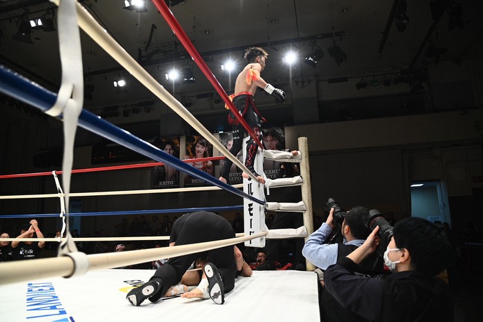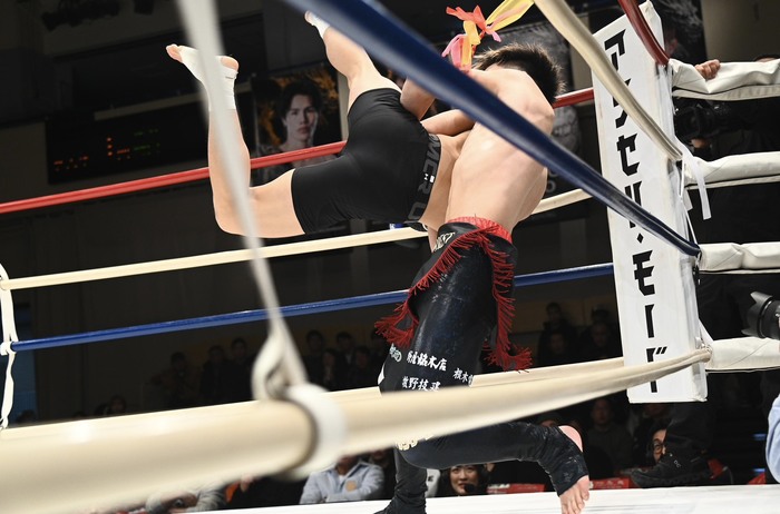 しかし、ブレイク直後、片山が走り込んでの飛びヒザ蹴り。これが見事にヒットし、インスはダウン。しばらく立ち上がれないほどのダメージを負った。