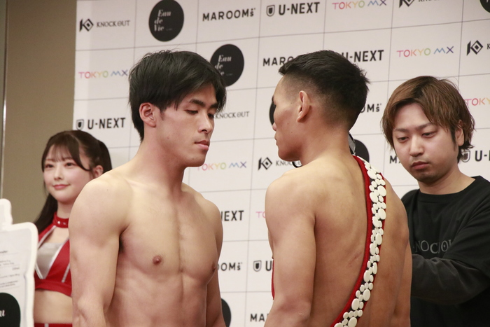 セミファイナル(第10試合)のKNOCK OUT-BLACKフェザー級タイトルマッチ3分3Rで対戦する、王者・古木誠也(REX GYM)は57.35kg、挑戦者チュームーシーフー(中国/郭強ファイトクラブ/CFP)も57.35kgでそれぞれ計量をパス。