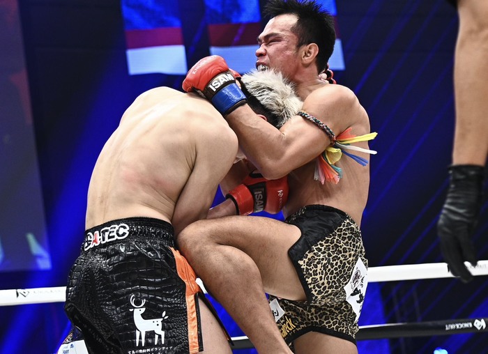 それでも前へ出て左右フックを放つゴンナパー。久井は打ち合わず、胴タックルでゴンナパーを止めてしまう。するとゴンナパーは首相撲からのヒザ。久井は左の縦ヒジ。笑うゴンナパーはパンチを打ち、ヒザ。組んでゴンナパーを投げ捨てる久井。そしてワンツー。ジャブでゴンナパーの足がもつれる。