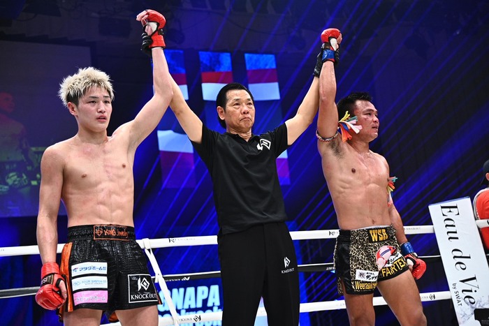 久井は左カーフを蹴り、ジャブを出して回復を待つ。前へ出るゴンナパーが左フック、久井をコーナーへ詰めると久井はクリンチ。久井のワンツーに右ヒジを合わせようとするゴンナパー。下がる久井にゴンナパーがジャブ、組むとヒジ。久井は右の三日月とジャブで反撃するが、ゴンナパーの圧力と強打が目立った。