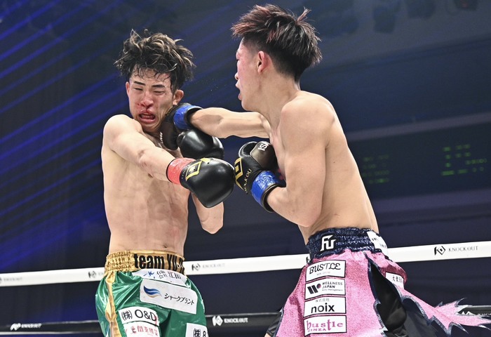 2Rが始まってすぐ、歩希の左ボディでYOSHIHIROが後退。すかさずラッシュをかけるYOSHIHIROがヒザでスタンディングダウンを奪う。歩希は前蹴り連打からヒザ、YOSHIHIROもワンツーとで反撃。歩希の左ボディに苦しみながらも、鼻血で顔面を朱に染めながら打ち返す。