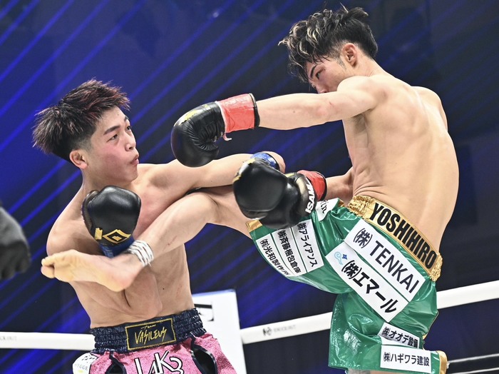 1R、YOSHIHIROは右ローと左ミドル、蹴り主体に攻めて歩希がパンチを出してくると右で迎え撃つ。歩希が右ローを蹴ると強い左ミドルを出すYOSHIHIRO。歩希は左カーフと左ボディ、YOSHIHIROはスイッチして左ハイから左ストレートを打っての左ヒザというコンビネーション。