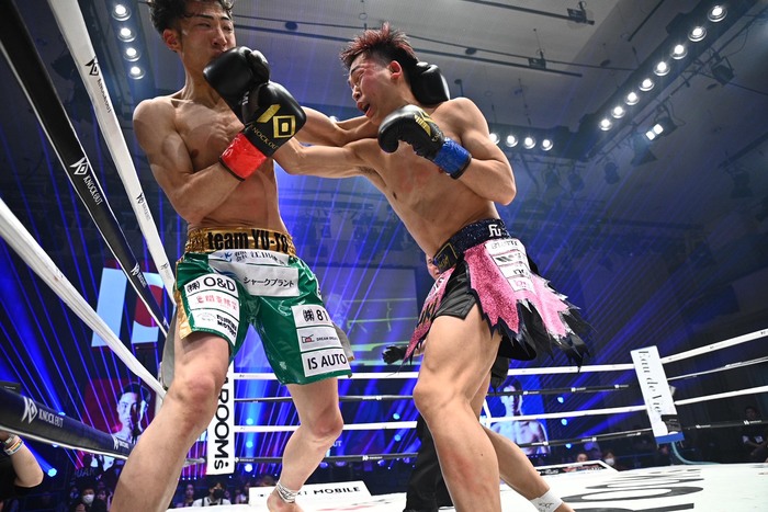 3R、ワンツー・逆ワンツーの歩希にYOSHIHIROも全力のワンツーとヒザで反撃。歩希の左フックに大きくグラつくも、また前に出てワンツーを打つ。右ボディに左ローで前へ出るYOSHIHIRO、さらに左ボディストレート。歩希は右ミドルからの右ストレート。両者フラフラになりながらもフルスイングの右を放ち、互いに被弾するが歩希の方がパワーがある。