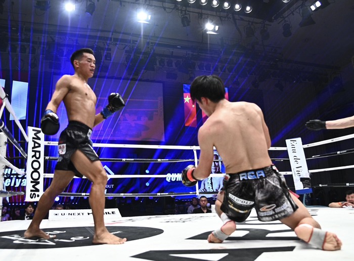 向かい合った古木が一瞬左のガードを下げたところに、チュームーシーフーが右へ回り込むような動きからの左フックでダウンを奪う。古木が右を伸ばすところにチュームーシーフーは左フックをフルスイング。さらに右フックも連打。古木は顔面とボディへの前蹴り。