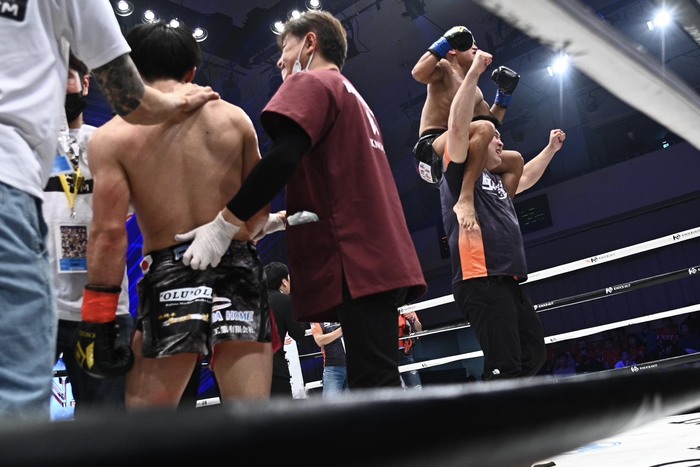チュームーシーフーはマイクを持つと「コンバンハ、KNOCK OUT! 自分がKNOCK OUTに参戦したのが2023年でしたが3年かけてやっと念願のベルトを手にすることが出来ました。この階級の王になるために厳しいトレーニングを経て日本のリングに上がりました。KNOCK OUTの王者らしくこれから戦っていきます。もちろん王者として、このベルトを防衛したいですが、チャンスがあればアンリミテッドルールもREDルールも興味あります。自分が中国人として初めてのKNOCK OUT王者になりたいと誓って実現しました。中国はいま春節なので中国の同胞の皆さん、おめでとうございます。そしてイ族として戦っていきたいと思います」とアピールした。