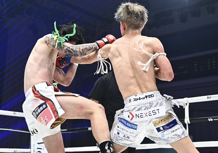2R、壱の左ストレートにワンツーを返す前田、壱の左ローにも右ローを返す。足を止めての打ち合いになると前田が左フック、壱が左ストレート。前田が蹴り続ける右インローにバランスを崩した壱。すぐに前へ出て左ミドルを蹴っていく。