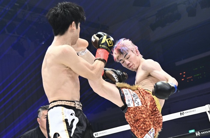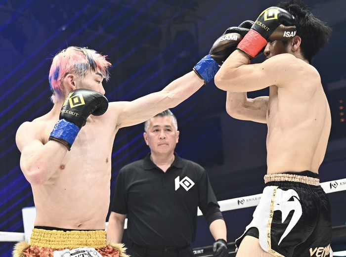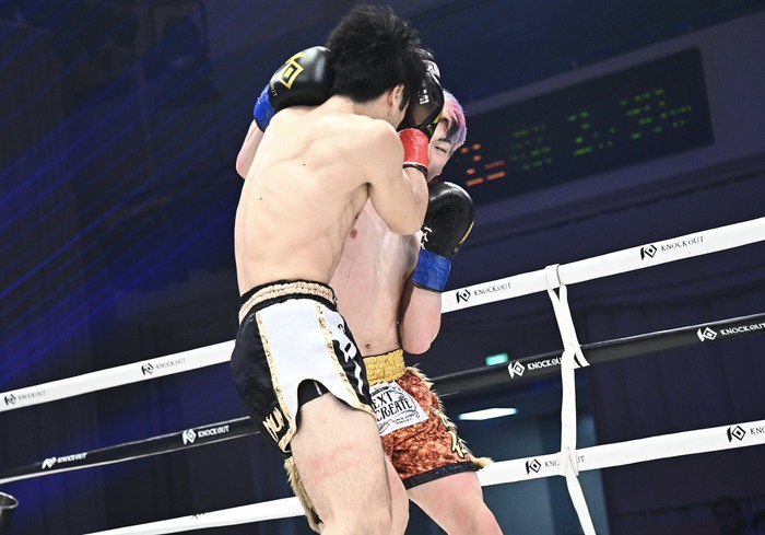 1R、右カーフからのワンツーで前へ出る木村に乱牙も右カーフを蹴る。蹴りとワンツーのバランスがいい木村は、サウスポーにもスイッチして左ミドルを蹴る。右のフェイントから左ボディを当てる木村に、乱牙はしつこく右カーフ。木村のワンツーにのけ反る乱牙。木村はサイドキックも繰り出す。