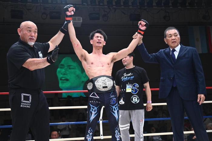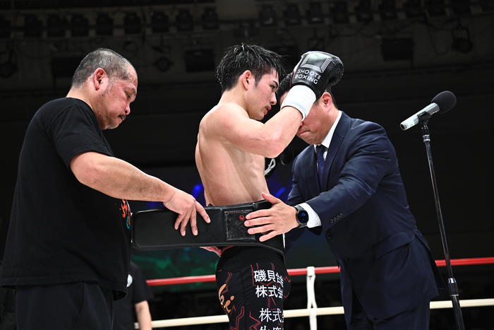 【写真】ベルトは緒形健一SB協会代表が代わって巻いた