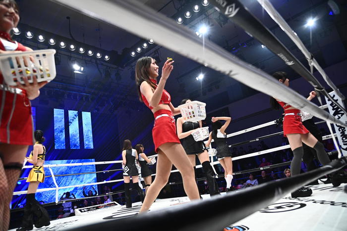 大会終了後には、バレンタインデーの翌日ということでリング上から観客へチョコのプレゼントも。多くの観客が残り、立ち上がってラウンドガールたちにアピールしていた。