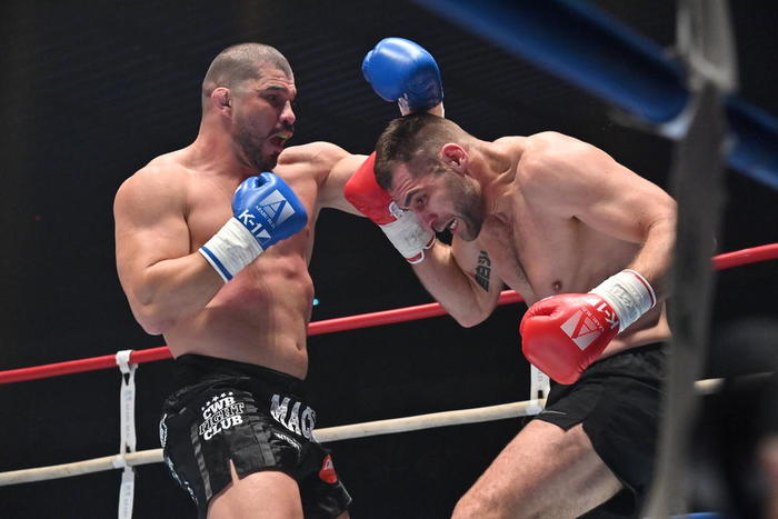 K-1 WORLD GPヘビー級タイトルマッチ3分3R延長1Rでは、王者アリエル・マチャド(ブラジル/Hemmers Gym/Madison Team)がクラウディオ・イストラテ(イタリア/Accademia NKT Team Saitta) を挑戦者に迎えての初防衛戦。