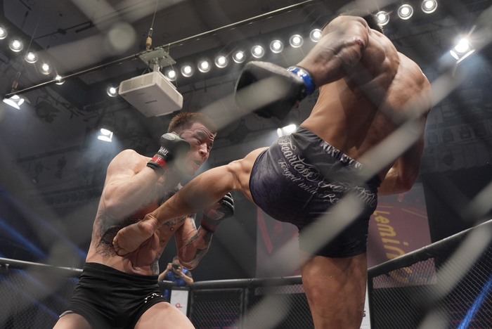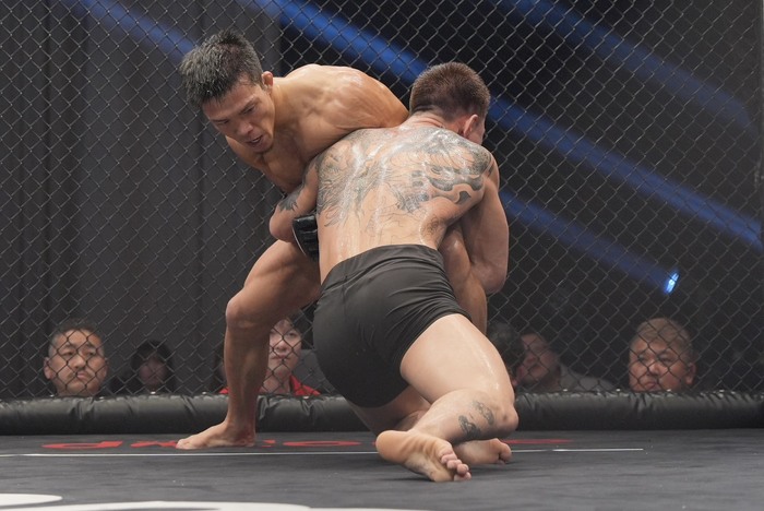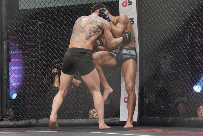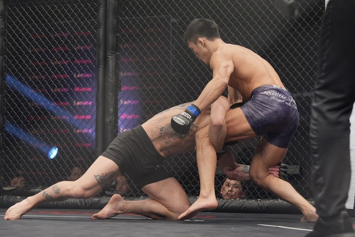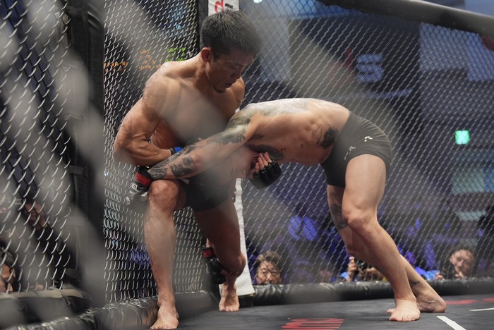 2R、オーソドックスからスイッチする齋藤はテイクダウン狙うシンバートルに右アッパーを狙う。組みを2度トライするシンバートルシングルレッグテイクダウンで齋藤に尻を着かせるが、齋藤は上体は立てたままケージ背に。齋藤の足を広げた立ち上がりに膠着ブレ-ク。