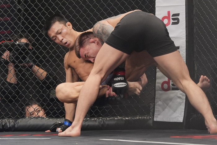ケージに座り、足を抜く齋藤。自身の右腿に齋藤の両足を乗せるシンバートル。しかし足を引いて両足を広げて立とうとする齋藤。再び力使い足を束ねるシンバートルだが、齋藤は足を戻してヒジ。シンバートルは再びダブルレッグ、サイドバックからパウンドでホーン。シンバートルのラウンドに。