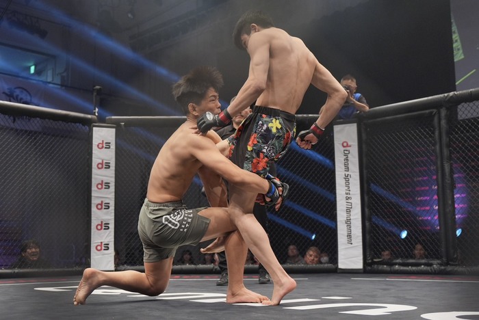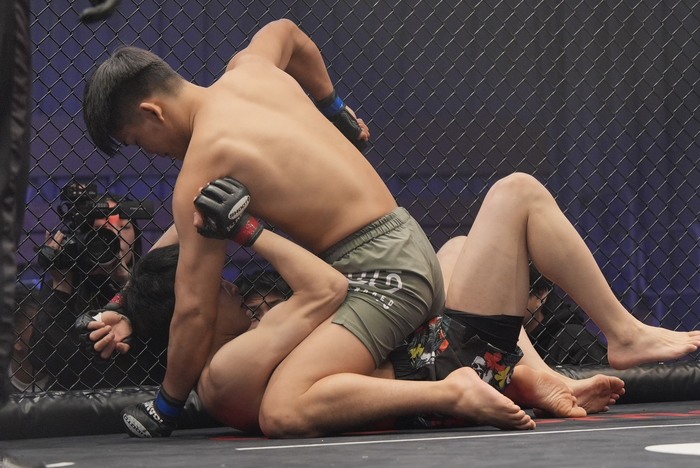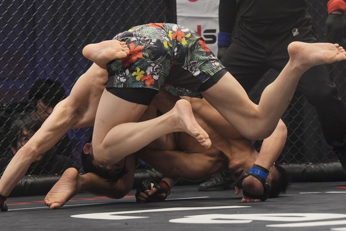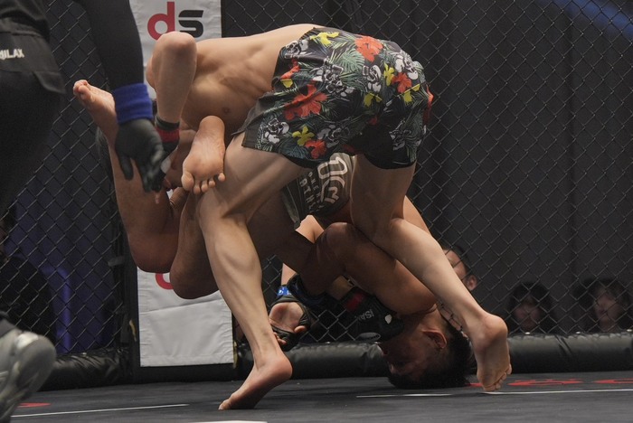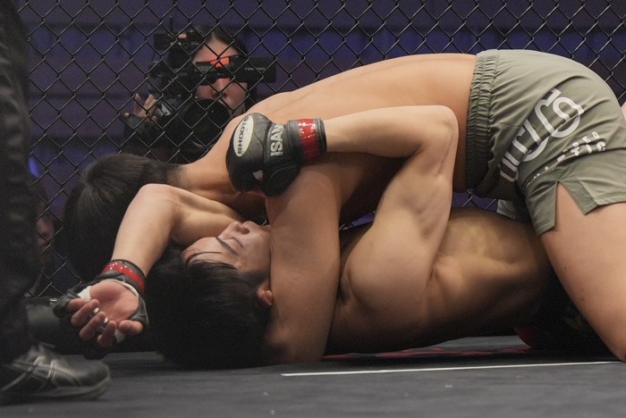 1R、ダブルレッグに入った内田に、青井はカウンターの右ヒザ! 音を立ててヒットも内田はそのまま組んでボディロックテイクダウン。すぐに足越えマウント。