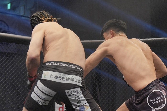 右ジャブ、堀江の入りに左フック狙うTOMA。堀江はダブルレッグも差し上げるTOMA。跳びヒザで入ると左右フックをガード上に突いて左跳びヒザもブロックの堀江。