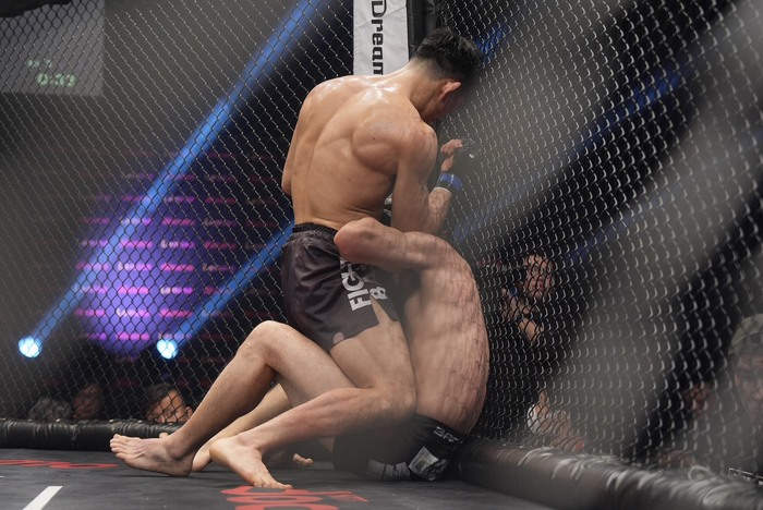 押し込みヒザの堀江のシングルレッグにTOMAはネルソンもそこに足を手繰り尻を着かせる堀江、ギロチン狙い。金網背に立つTOMAに右ヒジを3度滑らせる。