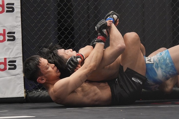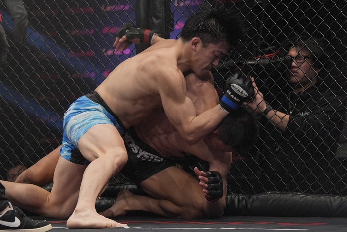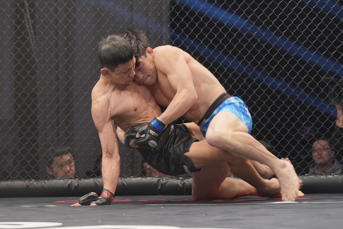 1R、ともにサウスポー構え。ジャブの差し合いからダブルレッグの松下。差し上げる宮城に、離れて左右からシングルレッグ、ボディロックテイクダウンを決めた松下。フルガードの宮城に上からパウンド。金網に頭が詰まりながらも三角絞め、蹴り上げで立ち上がりを狙う宮城。左で差して立ち上がり。