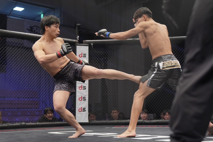 1R、ともにオーソドックス構え。小祝が右カーフを当てて井上はインローを返す。右で差して組んでボディロックテイクダウンの小祝。ケージ蹴る井上を押さえて腕十字を狙いつつ、シングルバックに。