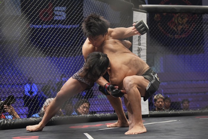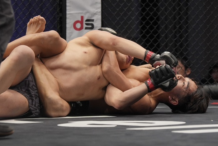 2R、井上はカーフから前蹴りがローブローに。中断、再開。小祝はサウスポー構えからオーソにしてシングルレッグから後方にテイクダウン。立とうとする井上のバックについてボディトライアングル。背後からパウンド。リアネイキドチョークを狙うもホーン。
