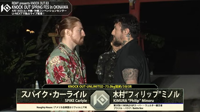 カーライルは「このKNOCK OUTの試合に参加できることをとても光栄に思っていて、沖縄で試合をするってことで今日は沖縄っぽいシャツを着てきました。木村選手はバッドガイのイメージがあるけれど、本当は凄くスイートハートで優しい心を持っていると思うので試合を凄く楽しみにしている。2人ともパワーファイターで僕たち2人がぶつかってパワフルないい試合になると思っています」とコメントした。