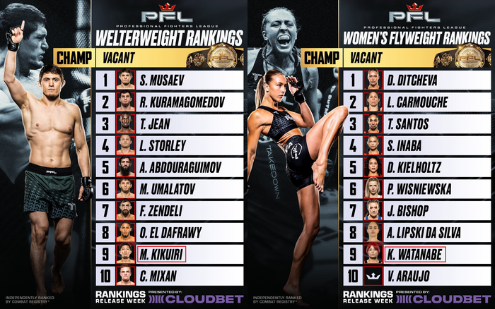 【写真】菊入はPFLウェルター級9位、渡辺華奈は女子フライ級9位。日本からはSASUKEの契約も発表されている。