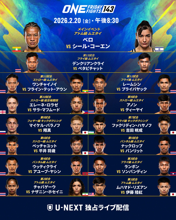 2026年2月20日(金)タイ・ルンピニースタジアム『ONE Friday Fights 143』(U-NEXT配信20:30開始)に出場する、日本人4選手の直前コメントが主催者を通じて発表された。