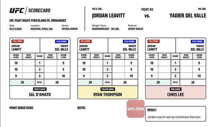 判定3-0(29-28×3)でレビットが2連勝。地元ヒューストンのデル・ヴァイエはMMA10連勝(UFC2連勝)中だったがストップ。