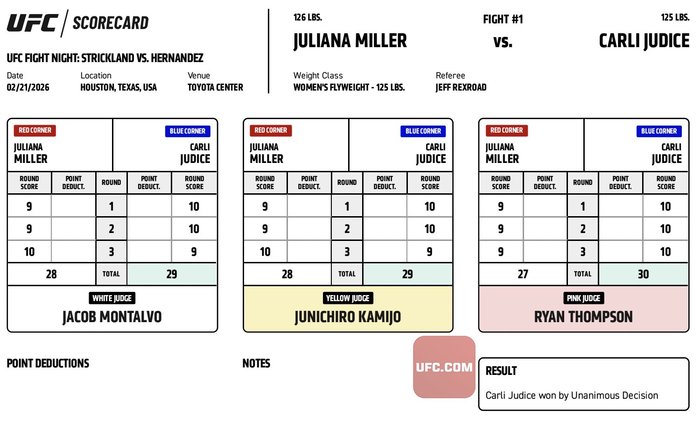 判定は3-0(29-28×2、30-27)でジュディスが勝利。UFC3連勝をマーク。
