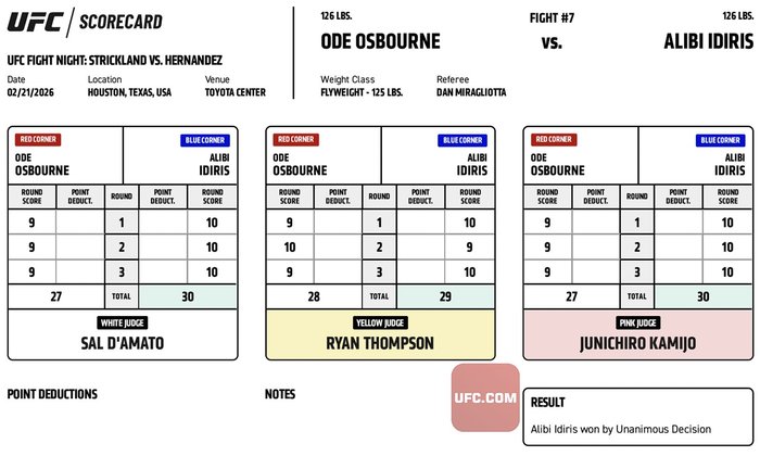 判定は3-0(29-28, 30-27×2)でカザフスタンのイディリスが勝利。MMA11勝1敗に。TUF33ファイナリストのイディリスがUFC本戦初勝利を挙げた。